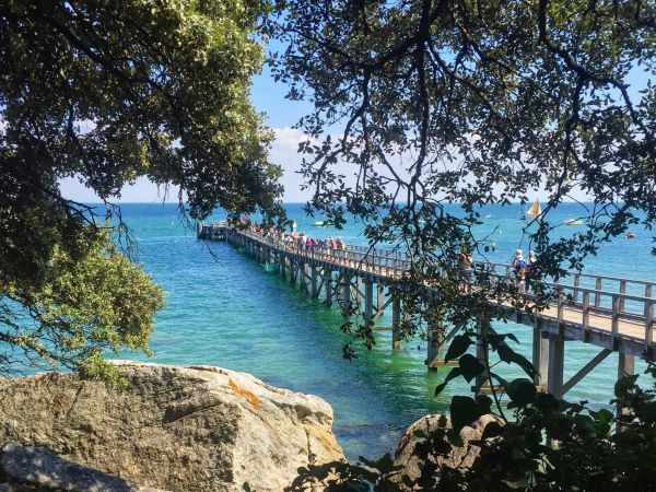 La traversée s’est faite en une heure. Le temps d’admirer ce beau lac tranquille qui est la baie de Noirmoutier, l’île, toute rose, en face, qui se rapproche à chaque instant, et se découpe, plus nette, sur un ciel de nacre fine ; à sa gauche, la tour du Pilier et les récifs du Moine, frangés d’écume ; à sa droite les dunes plates qui rayent la mer comme d’un trait d’encre violette, le village de Barbâtre dont les maisons blanches et les moulins à vent semblent baigner dans l’eau, le passage du Gois, marqué de distance en distance par de hautes balises, qui se découvre et se dessèche aux heures du jusant… et déjà nous accostons à l’estacade (1) du bois de la Chaise, un bois de pins tristes et d’yeuses superbes, aux troncs tordus, au feuillage presque noir. Juché sur un des madriers de l’estacade, un amateur de pêche maugrée, sous le large chapeau de paille en forme de cloche qui l’abrite, comme d’une tente. Subitement dérangé, il replie sa ligne d’un air furieux et s’en va… [...]