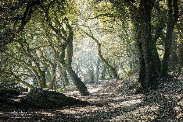La route serpente, dans la bruyère fleurie, entre les pins et les chênes verts, côtoie des rochers tapissés de lichens bizarres et de petites plantes jaunes au parfum de vanille. Une femme qui ramasse des aiguilles de pin, , pieds nus, la tête couverte d’un mouchoir à carreaux rouges, s’interrompt de travailler et vient vers nous, souriante et sans hâte.