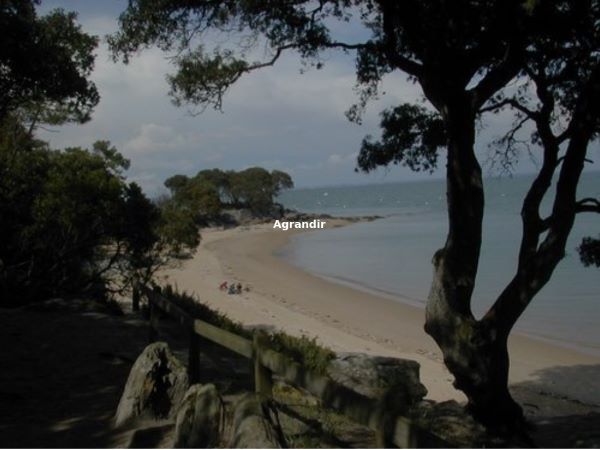 La traversée s’est faite en une heure. Le temps d’admirer ce beau lac tranquille qui est la baie de Noirmoutier, l’île, toute rose, en face, qui se rapproche à chaque instant, et se découpe, plus nette, sur un ciel de nacre fine ; à sa gauche, la tour du Pilier et les récifs du Moine, frangés d’écume ; à sa droite les dunes plates qui rayent la mer comme d’un trait d’encre violette, le village de Barbâtre dont les maisons blanches et les moulins à vent semblent baigner dans l’eau, le passage du Gois, marqué de distance en distance par de hautes balises, qui se découvre et se dessèche aux heures du jusant… et déjà nous accostons à l’estacade (1) du bois de la Chaise, un bois de pins tristes et d’yeuses superbes, aux troncs tordus, au feuillage presque noir. Juché sur un des madriers de l’estacade, un amateur de pêche maugrée, sous le large chapeau de paille en forme de cloche qui l’abrite, comme d’une tente. Subitement dérangé, il replie sa ligne d’un air furieux et s’en va… [...]